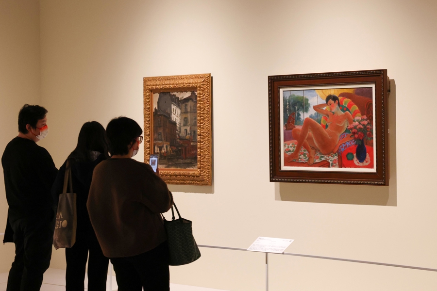 在第二特展厅中,有一个半独立的特殊区域,是此次特展中的最重要板块之一“复调回响”,展示印象派对黑田清辉、佐伯祐三等日本艺术家,以及对刘海粟、常玉、潘玉良等中国艺术家的影响。印象派作为西方19、20世纪的流行艺术流派,启发了众多亚洲艺术家的创作之路。比如黑田清辉是把艺术人体写生带回日本的第一人,成为日本美术教育的重要推动者。常玉、潘玉良等留法艺术家,曾去日本、欧洲考察艺术教育的刘海粟,以及陈抱一、王悦之等到日本学习西洋绘画的艺术家,也都不同程度地受到印象派影响。