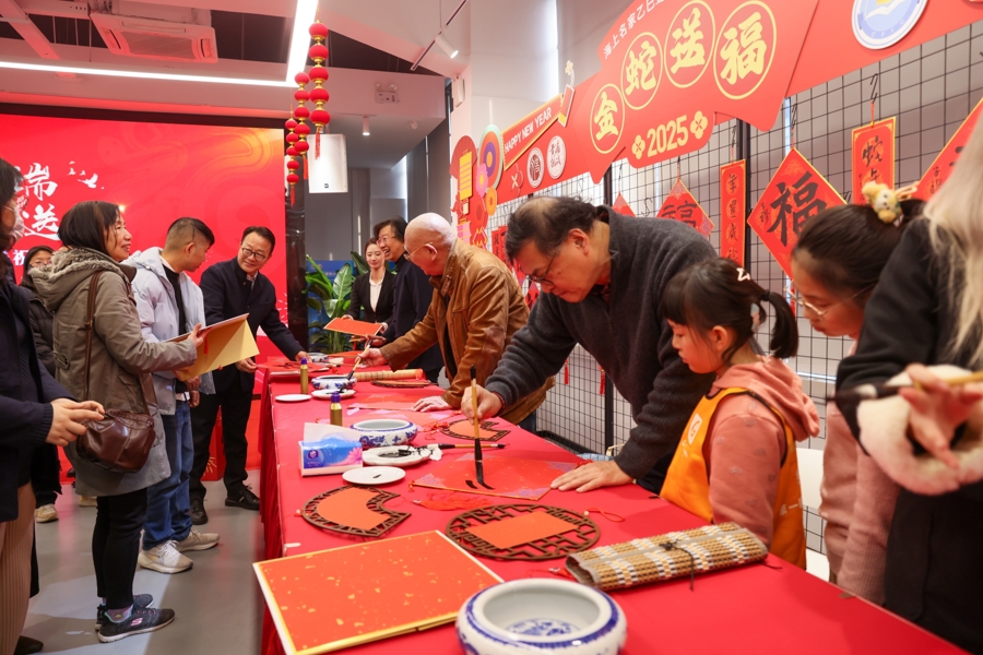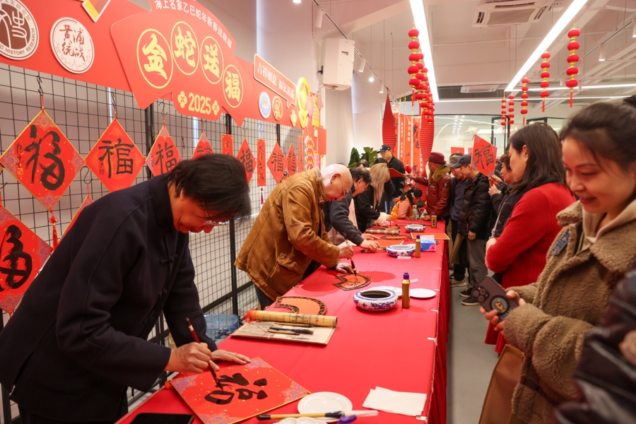“年就该热热闹闹地过,找个理由出去乐一乐。”置身“海上名家乙巳蛇年新春送祝福”活动现场,望着整整两面墙的大红福字和祝福语,上海市文史馆馆员鲍鹏山如是感叹。当天,他在集瑞里党群服务站为瑞金二路街道的居民分享中华传统礼仪与“福”文化,并接受本报记者专访畅聊对于“年味”的理解。