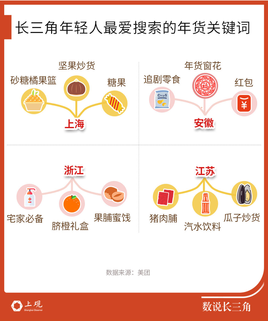 从长三角各地年轻人最爱搜索的年货关键词来看,上海年轻人最爱搜索“坚果炒货”“糖果”“砂糖橘果篮”,江苏年轻人爱搜索“猪肉脯”“汽水饮料”“瓜子炒货”,浙江年轻人爱搜索“宅家必备”“脐橙礼盒”“果脯蜜饯”,安徽年轻人爱搜索“追剧零食”“年货窗花”“红包”。