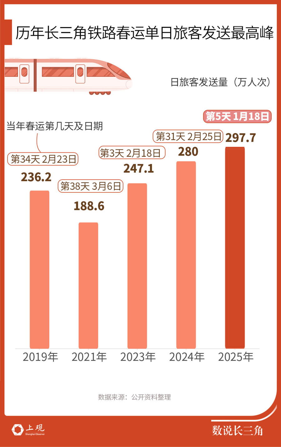 春运第五天,今年单日旅客发送量高峰已创历年春运长三角铁路单日客发量新高。1月18日,春运第五天,长三角铁路发送旅客297.7万人次,这较此前春运单日客发最高纪录多近20万人次。