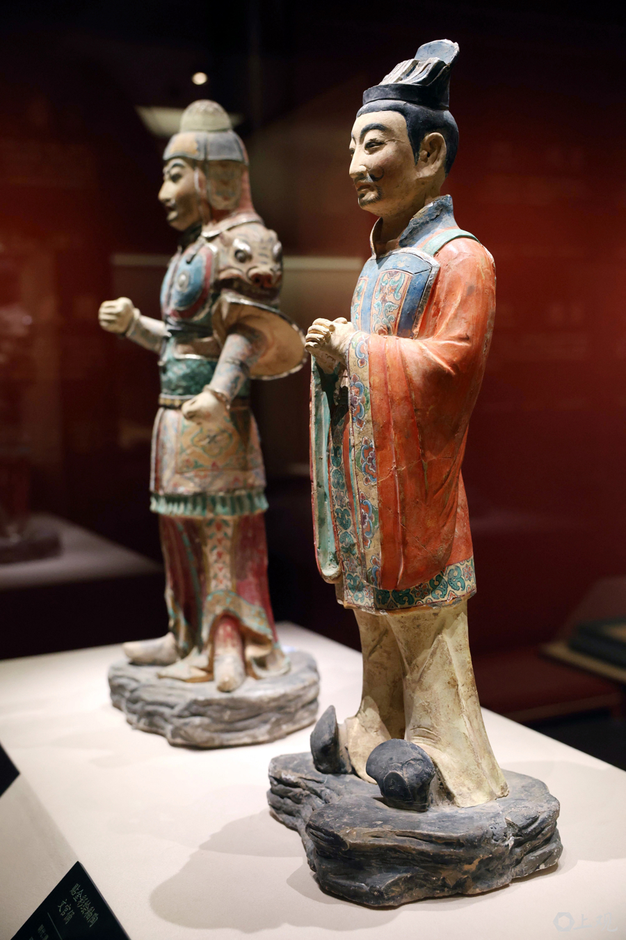 贴金彩绘釉陶文官俑(右)。雕塑者运用写实的手法表现出大唐帝国满腹治国方略的文官形象。贴金彩绘武官(左)。