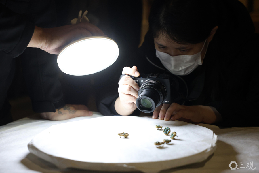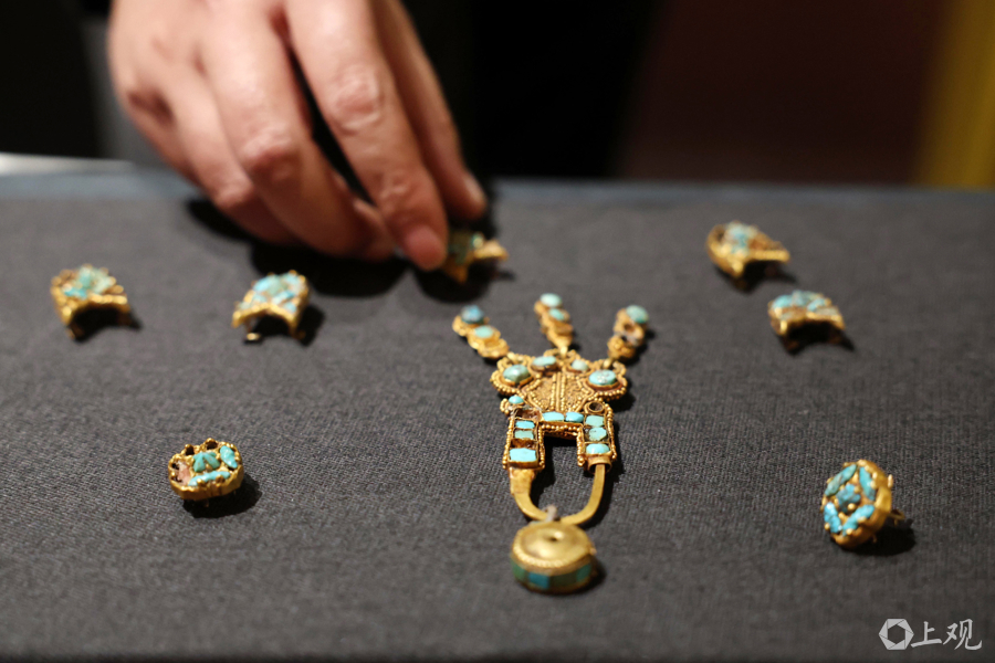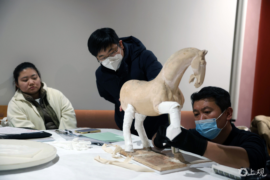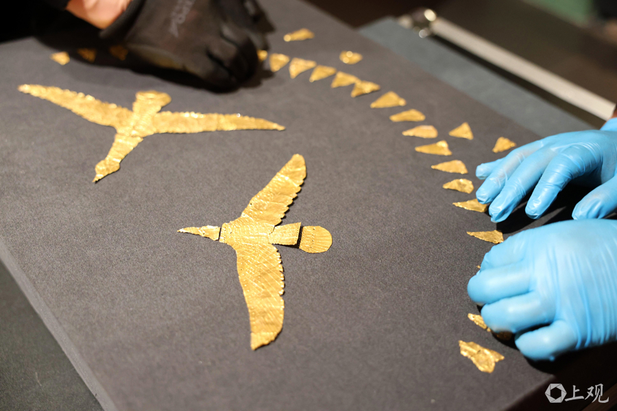 组合展览的文物,工作人员摆出最佳呈现形式。