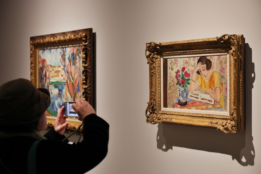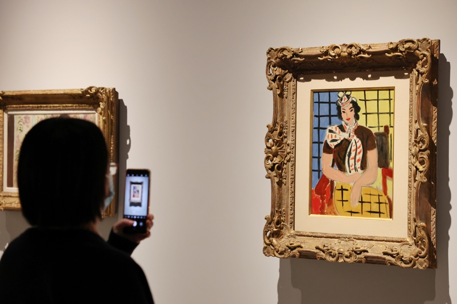 观众欣赏亨利•马蒂斯作品《戴围巾的女子》。