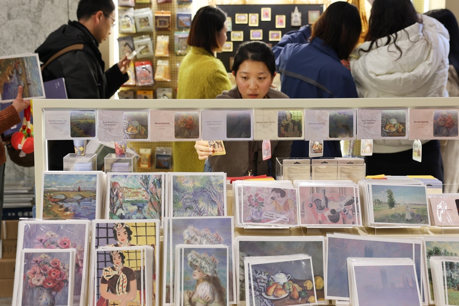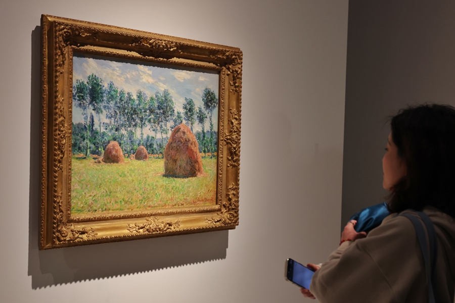 观众欣赏克劳德·莫奈作品《吉维尼的干草堆》 。