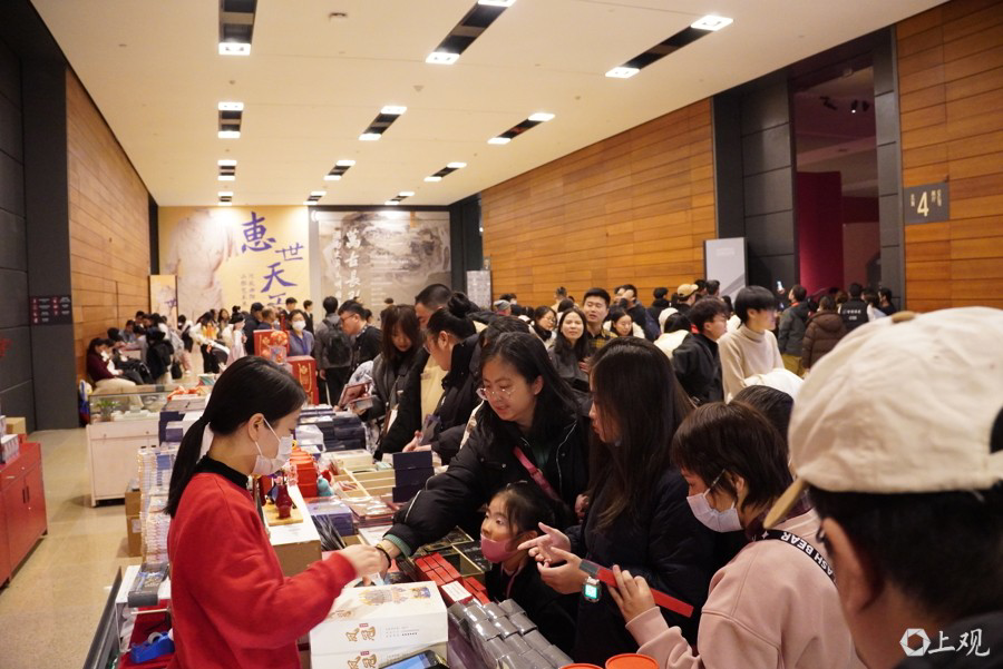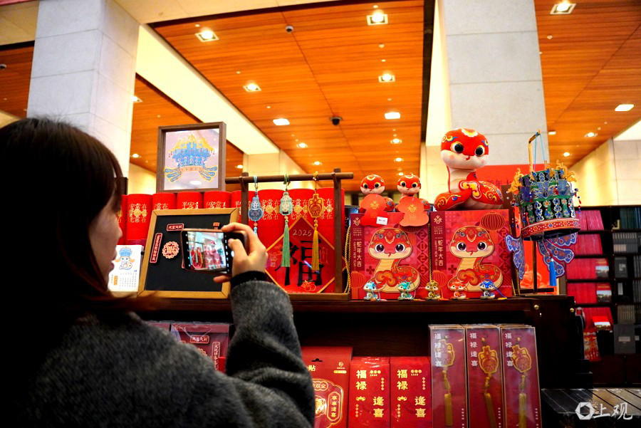 新春期间,国博的西大厅开启了节庆布置,蛇陶俑、孝端皇后凤冠等六款寓意吉祥的馆藏精品文物,以巨幅海报、文物仿制品、衍生文创的组合形式呈现,供观众打卡留念。西大厅南侧的综合休闲空间也在昨天开放,观众可以在这里阅读、喝咖啡、品美食,还可以购买文创,40余款新春文创刚刚上新。