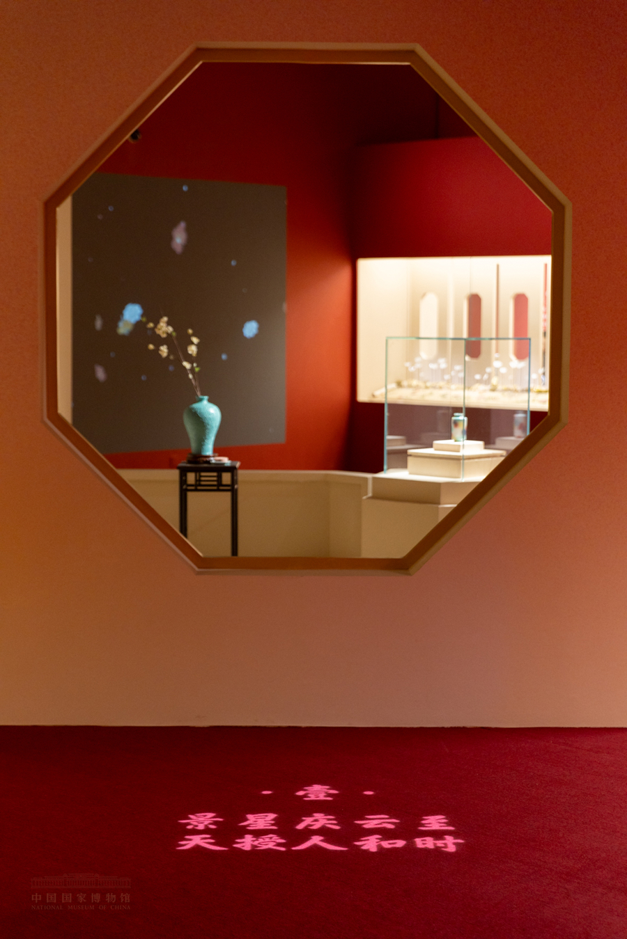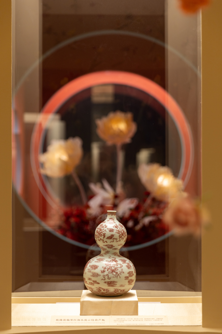 这次展陈空间的设计采用了园中园的古典造园手法,方形、圆形、八角形等形态各异的窗,为文物展陈和花器陈设增添了雅趣。百花图卷与形态各异的玉蝴蝶构成富有韵味的装置性展示。各类寓意吉祥的文物,如“福禄”葫芦与空间布景形成呼应。互动屏、交互式投影更是拉近观众与文物的距离。