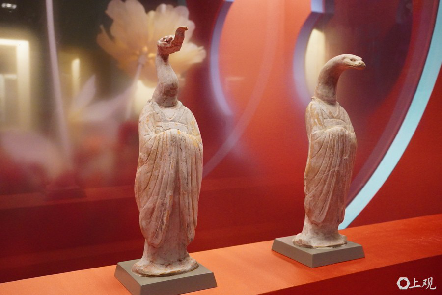 机器狗穿上年味十足的新衣,为首批进入展厅参观的游客送上揭幕“舞蹈”。迎面正对游客的便是两尊彩绘生肖龙陶俑、蛇陶俑。陶俑作兽首人身造型,人身直立,穿交领宽袖衣,长垂至足,两手笼袖拱于胸前,颇为生动有趣。
