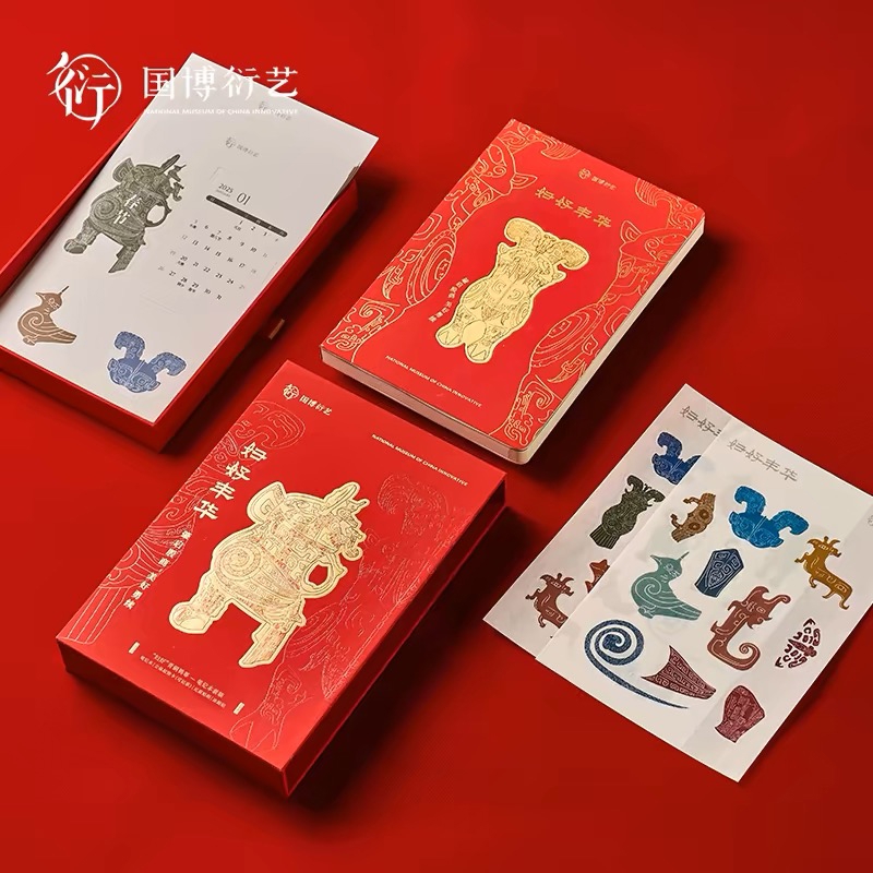 换日历、贴春联、备礼盒、发红包……春节必备好物,国博文创“一条龙”安排!《国博日历》《活版印刷月历》及笔记本套装三种不同风格、形式的日历,外观靓丽,功能多样。磁吸春联、春联冰箱贴多样选择,为传统用品带去新玩法。传统红包换新颜,立体凤冠“蓝包”,百鸟朝凤送祝福,葫芦套装红包,“福禄寿喜”全部囊括。元宵行乐年货礼盒里,点心、茶叶、红包样样俱全,外包装还是立体纸雕灯,点亮新春佳节氛围感。