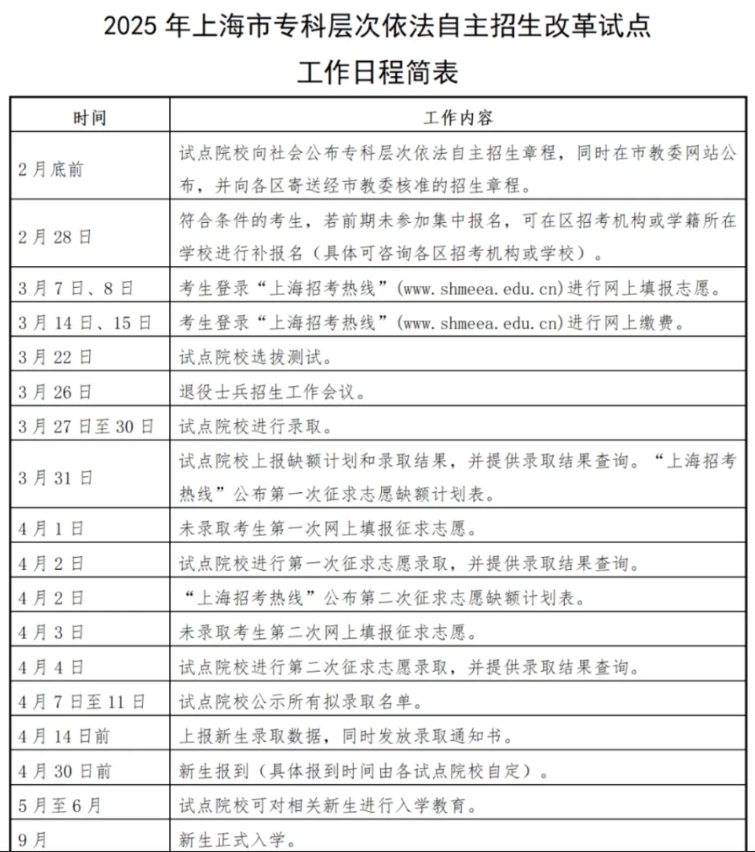 上海市教委表示,依据国家有关法规以及相关文件精神,2025年上海继续在部分普通高校专科层次实行依法自主招生改革试点。试点院校依法自主进行入学考试、确定入学标准、实施招生录取。通过试点,逐步完善“文化素质+职业技能”招生录取制度,健全与本科层次相对分开、符合职业教育特征的专科层次考试招生制度。