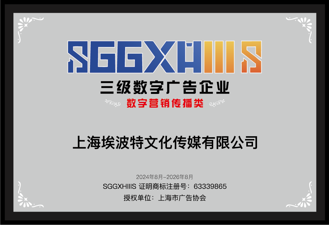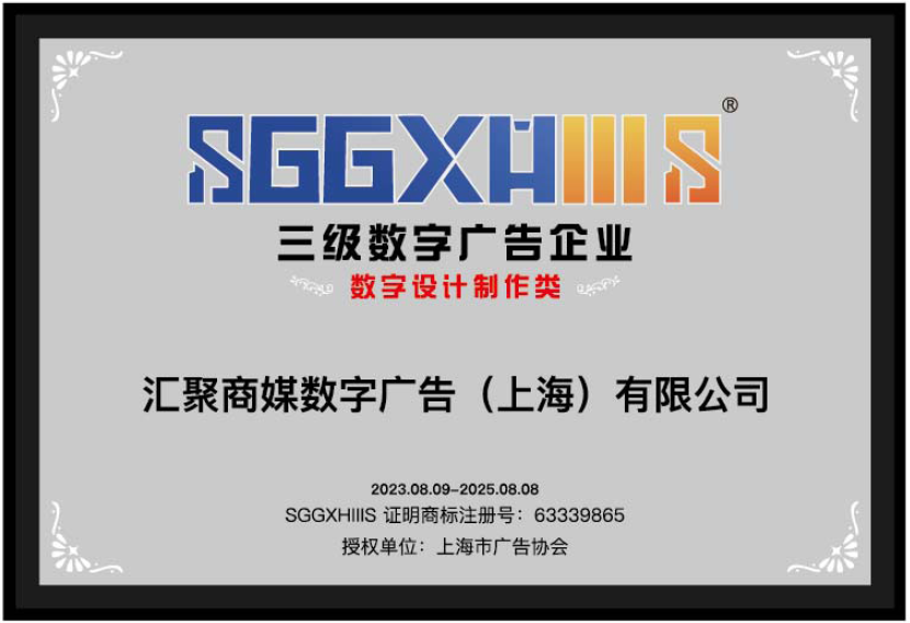 荣获上海市广告协会数字广告证明商标,不仅是对汇聚商媒数字广告(上海)有限公司专业能力的认证,更是对我们企业信誉和市场竞争力的极大提升。这一认证标志着我们在广告策划与执行方面的卓越品质,以及在行业内的广泛认可和权威地位。凭借这一权威认证,我们能够更有效地赢得客户的信任,拓展市场份额,并在与潜在客户的交流中树立起更加专业的品牌形象。