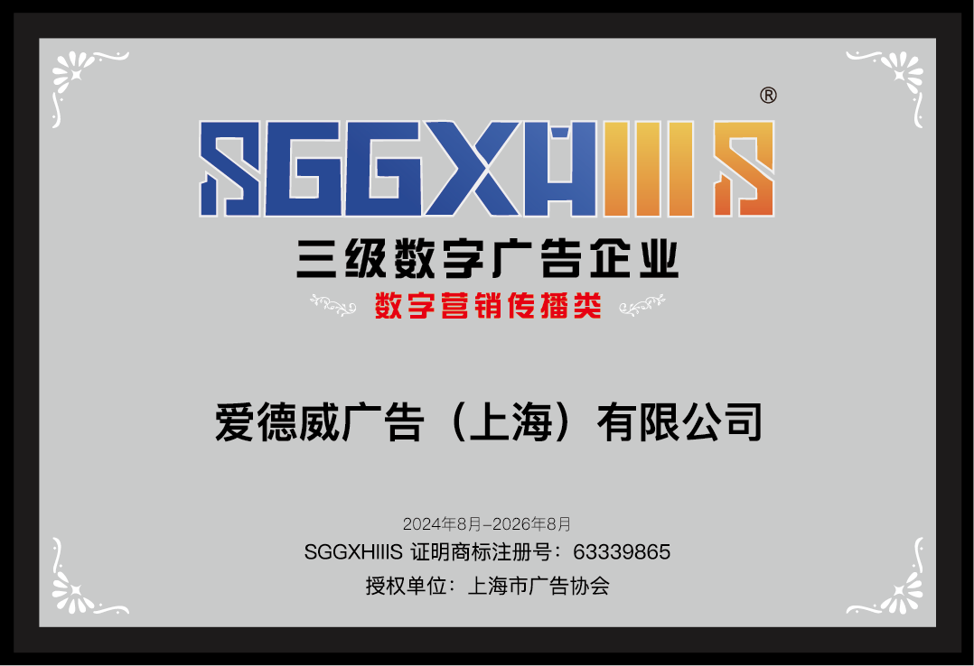 2024年,爱德威集团荣获由上海广告协会颁发的“三级数字广告证明商标企业”认证。这一认证是对企业在数字广告领域中创新力、技术能力、广告合规性和数据安全性的高度认可,获得该认证不仅标志着爱德威集团在行业中的竞争力,更体现了公司在广告投放的有效性和品牌传播的深度影响力,竞争力,为与品牌方建立更深层次的信任关系提供了有力保障。作为互联网营销行业内的领先企业,爱德威集团将继续以专业与创新为基础,确保为客户提供更可靠的广告服务,提升品牌传播效果。