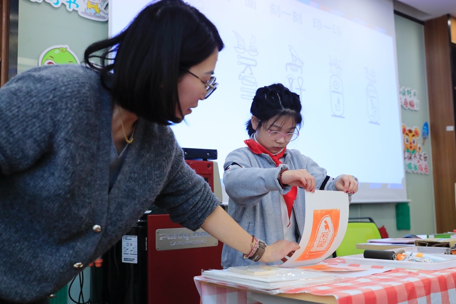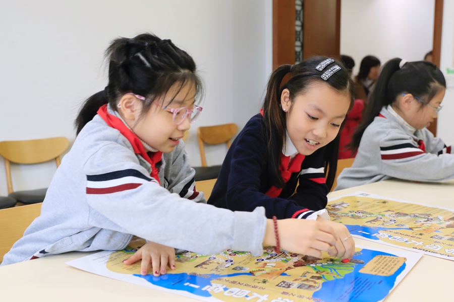 四年级学生沈歆瑶对莎草纸最感兴趣,“讲解员说的莎草纸上的故事很有趣”。从二楼展厅出来,学生们又奔向四楼,体验艺术手工《来自古埃及的召唤》以及游戏《尼罗河大冒险》。上博教育部工作人员顾婧介绍,古埃及国王一共拥有五个名字,分别是荷鲁斯名、两女神名、金荷鲁斯名、上下埃及之王名以及拉神之子名,孩子们可以体验用版画的形式去创作埃及的王名。由上博设计的手绘游戏图《尼罗河大冒险》,玩法类似“大富翁”,玩家可以从罗塞塔出发,在尼罗河上展开冒险之旅,直面狮身人面像,走进金字塔,认识古埃及众神。