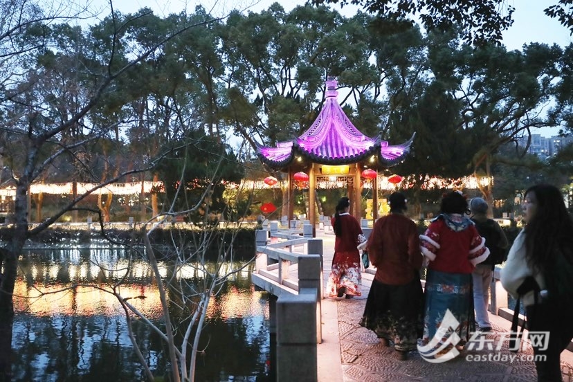 踏入上海古猗园,仿若穿越时空,步入一场盛大的“花韵夜宴”。南大门入口及照壁处,精心营造的场景将新春氛围拉满,十二花神如约而至,她们各怀绝技,或轻抚丝弦、或吟诗弄月、或翩然起舞,手持花韵法器踏出古韵节奏,演绎十二花韵。园内更以中国传统音律“宫、商、角、徵、羽”巧妙串联五大区域动线,吉祥元素、灵动花鸟与新年的喜乐氛围相融,配合非遗灯彩的熠熠华光,为游客开启一场视觉与听觉的奇幻旅程。