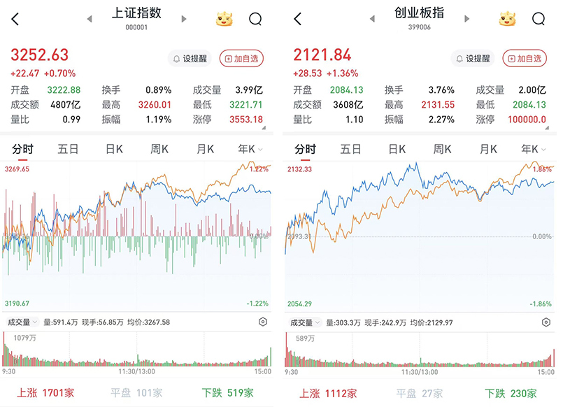 至收盘,上证综指涨0.7%,报3252.63点;科创50指数涨0.9%,报974.83点;深证成指涨1.15%,报10292.73点;创业板指涨1.36%,报2121.84点。