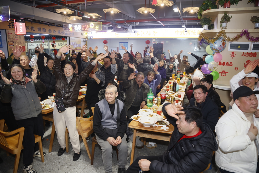 值得一提的是,商户里有着众多夫妻老婆店。为了增添年夜饭的趣味性,市场管理方还设置了互动环节。商户们用自己特有的方式或热烈、或含蓄、或深情地向对方表达相互扶持的谢意和浓浓的爱意,将现场气氛一次次推向高潮。年夜饭结束时,市集管理方还给所有商户送上“幸福感”满满的过年大礼包。“虽然今年我没有回老家过年,但今天真的很开心,认识了很多新的朋友!”经营水产的施金权说。