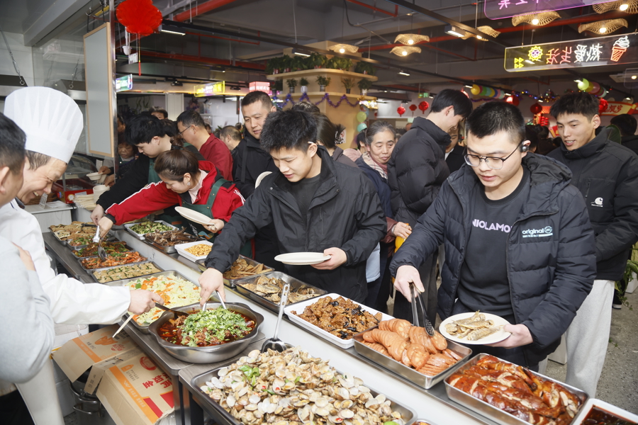 “这顿年夜饭让我充分感受到家的温暖,‘宁家’变‘我家’了!”1月19日晚,本该熄灯结束营业的宁家·黄山市集却比白天还要欢闹喧腾。一顿丰盛的年夜饭热气腾腾,市集管理方和商户共计120余人欢聚一堂,共迎新春佳节,共享“家的味道”。