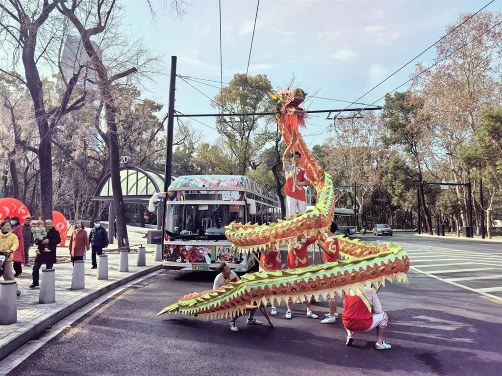 除了车身喷绘以外,记者注意到上海移动电视的32寸数字智能屏、20路沿线各站点屏,都循环播放着非遗传承人精心绘制的金山农民画,车内车椅背后也绘制了多幅趣味横生的画作。搭乘主题车,如同置身移动的美术馆,感受到根植民间的乡土气息。 当天,金山区文旅局还在20路中山公园站台为市民准备了丰富有趣的活动。热闹的舞龙表演、糖葫芦制作摊、农民画及剪纸传承人现场创作等仿若迷你小庙会,吸引了乘客纷纷驻足,还有外国友人也饶有兴致地参与进来。当天的乘客还能收到金山阿婆娘赠送香气扑鼻的米糕,非遗传承人赠送的农民画等充满年味的礼物。