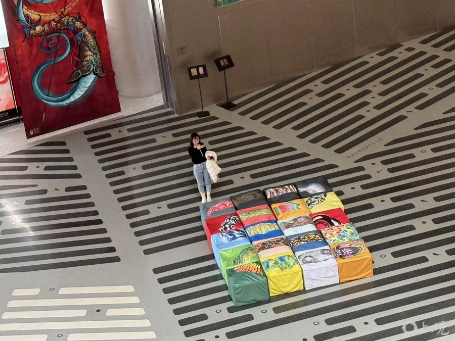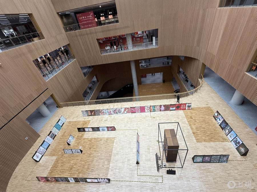 结合上图东馆这一国内最大单体图书馆的环境,所有展品被精心设计成具有公共性、互动性的作品。一楼中庭摆放了一个个方形沙发连缀成的蛇形长沙发,每一个的表面都是彩色艺术化的蛇身局部,读者任意拼接,可以形成不同样貌的蛇。从三楼往下看,是欣赏这条“蛇”的最佳视角。