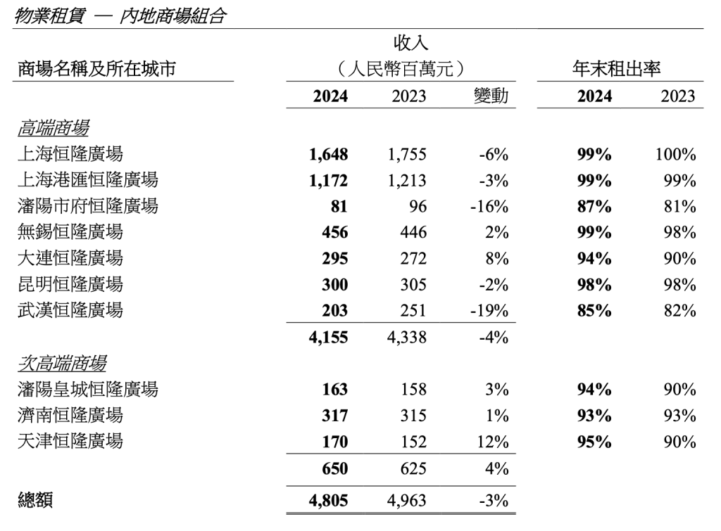 商场方面,2024年恒隆于内地的商场租合收入下跌,其中高端商场租合收入下跌4%。
