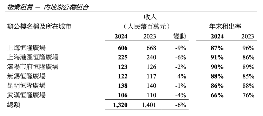 办公楼租合方面,整体收入同比减少6%。除了无锡恒隆广场录得4%的收入增长,其他办公楼的收入均录得同比下滑。其中上海恒隆广场办公楼收入跌幅最大,为9%。恒隆指出,在数个主要租户租约期满后,出租率于年末下跌9个百分点至87%,“上海市场仍然面对需求疲弱和供过于求的挑战。”