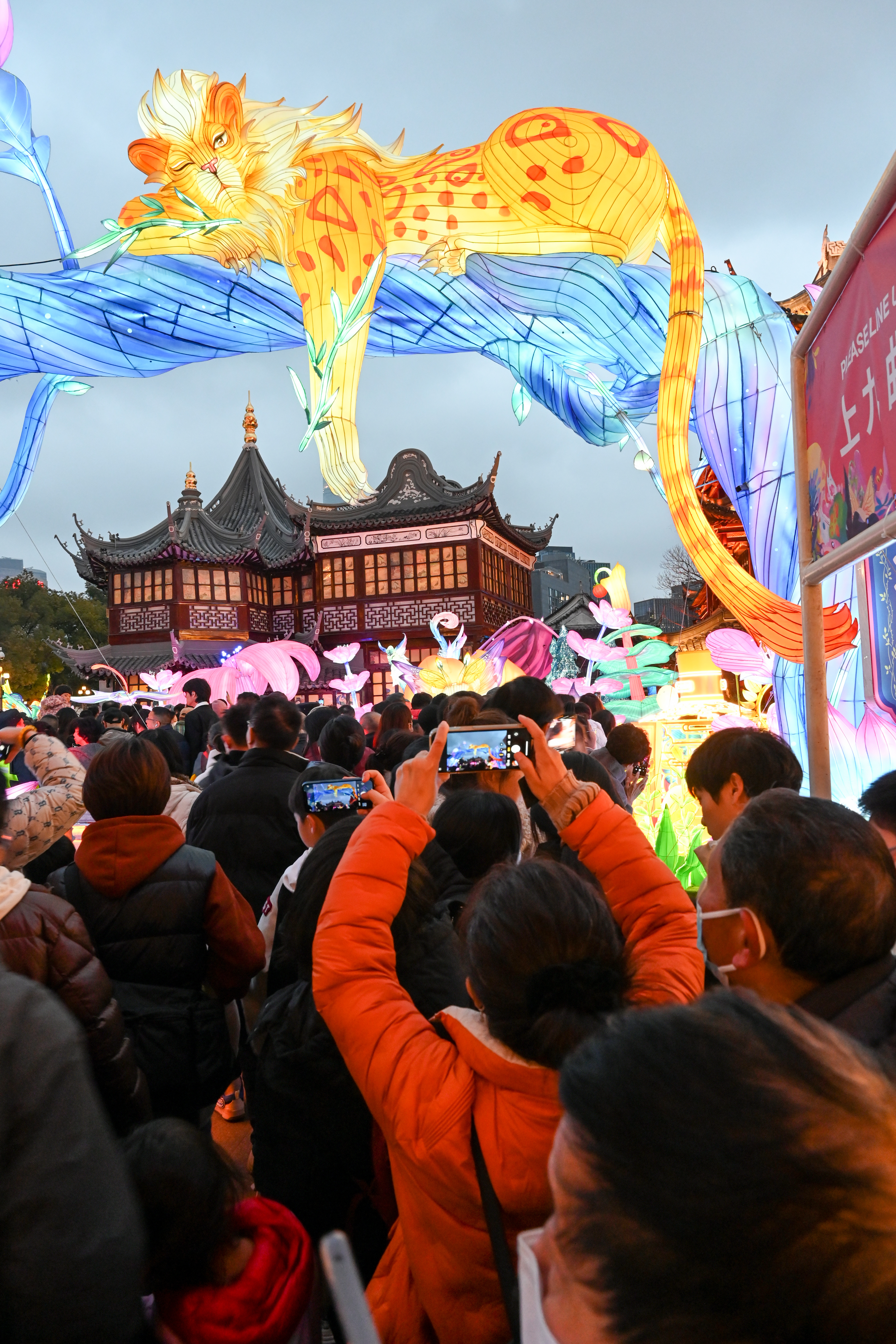 2025年1月23日,上海豫园。九曲桥上赏灯人流如织。
