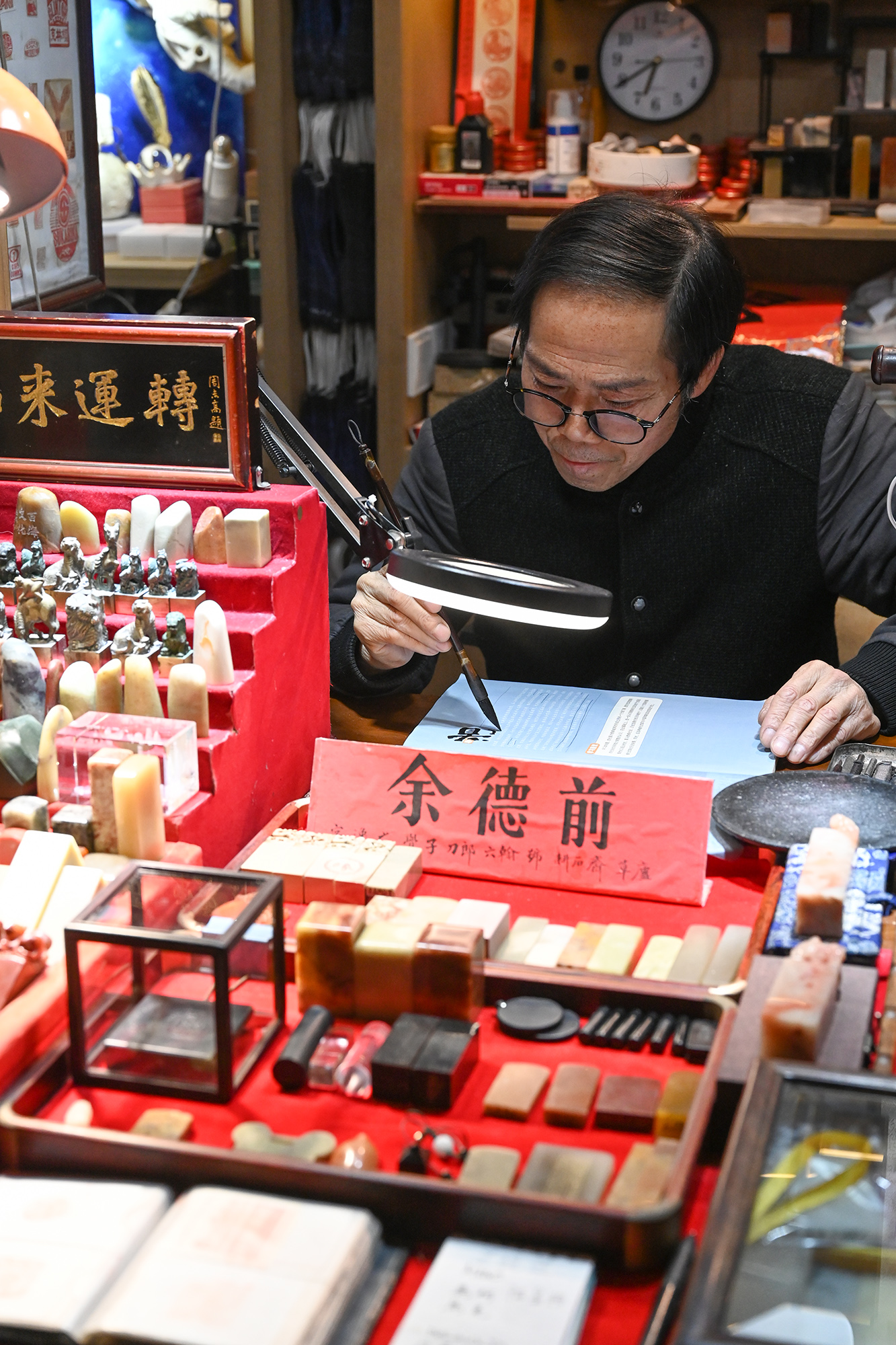 2025年1月23日,上海豫园。在园内设摊的店主正在写书法。