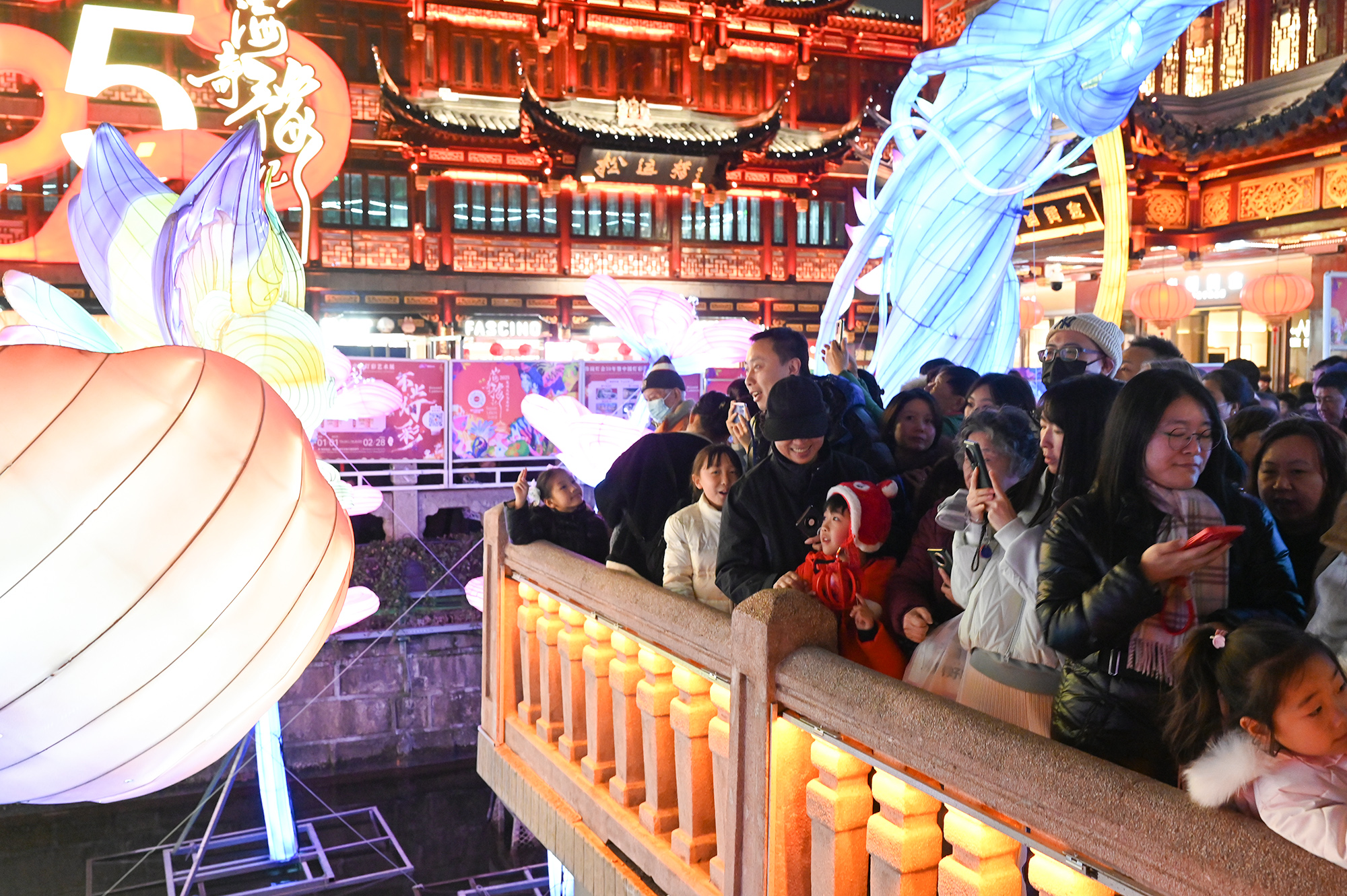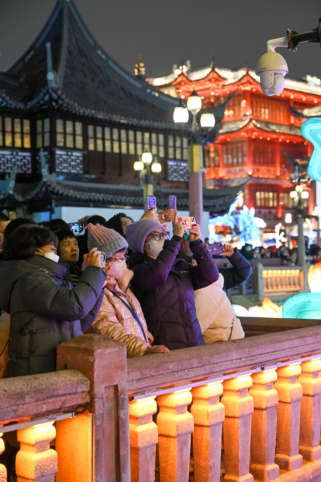 2025年1月23日,上海豫园。九曲桥上赏灯的人。