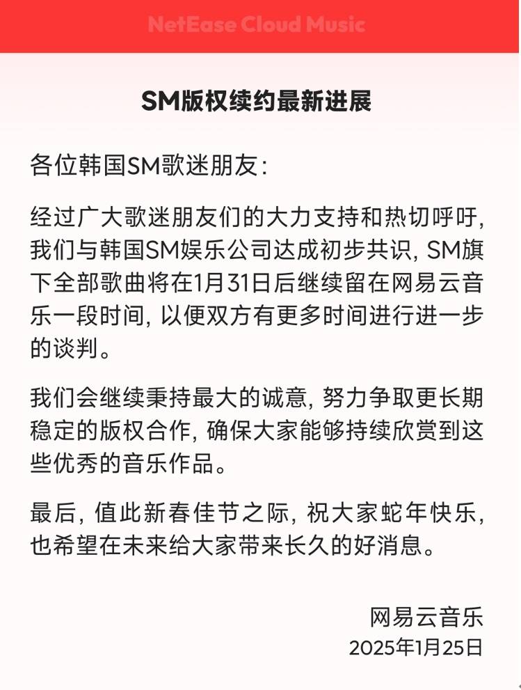 1月25日,网易云音乐发布《SM版权续约最新进展》公告,显示其与SM娱乐版权续约谈判出现转机,版权到期后暂时无需下架。公告表示,经过广大歌迷朋友们的大力支持和热切呼吁,网易云音乐与韩国SM娱乐公司达成初步共识,SM旗下全部歌曲将在1月31日后继续留在网易云音乐一段时间,以便双方有更多时间进行进一步的谈判。公告同时称,平台会继续秉持最大的诚意,努力争取更长期稳定的版权合作。