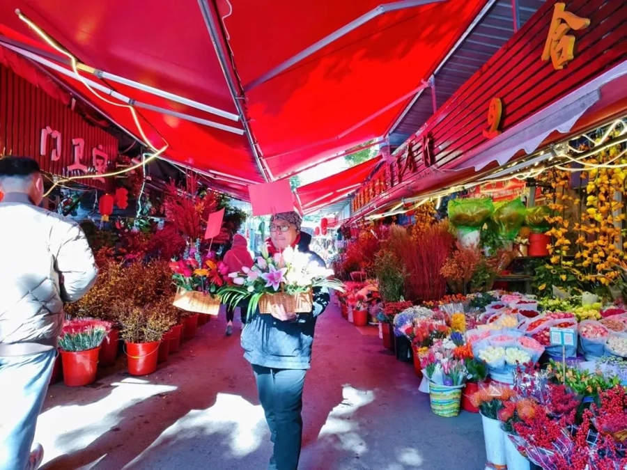 蕙兰、北美冬青、佛手花、水仙花、长寿花、杜鹃花等花卉盆栽也人气颇高,部分鲜花盆栽正在做特价销售,5元、8元、10元一盆就能买到手。“我们过年前都会来逛一逛,这里有年味,还热闹,再买一盆年宵花带回家,很喜庆。”家住附近的居民王阿姨,带着女儿一边悠闲逛市场一边选购年宵花。