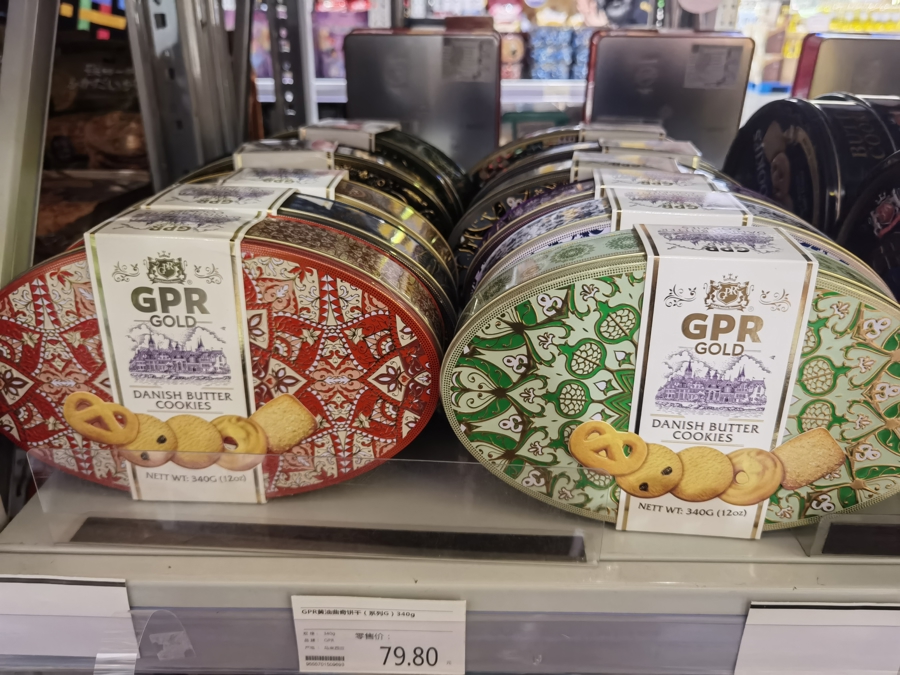 记者刚到现场,就看到一对情侣正在结账,手上拎着六七盒同款的饼干礼盒,看着就像准备送人的年礼。虹桥品汇运营部经理陈朋菲介绍说,其中一款来自马来西亚的GPR曲奇饼干特别受消费者喜爱,其外包装花花绿绿,十分喜庆,符合中国人过年的审美,口感也酥软、不粘牙,价格也实惠,每盒只要79.8元,为众多综合点心礼盒中的首选,最近一两周已卖出近1000盒。