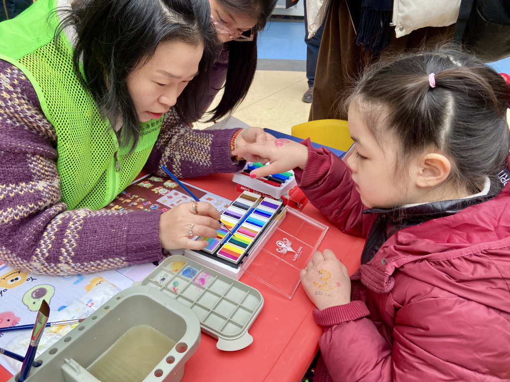 蛇年生肖文化活动期间,上海动物园推出丰富的科普和互动活动。图为工作人员在小朋友手上画蛇。