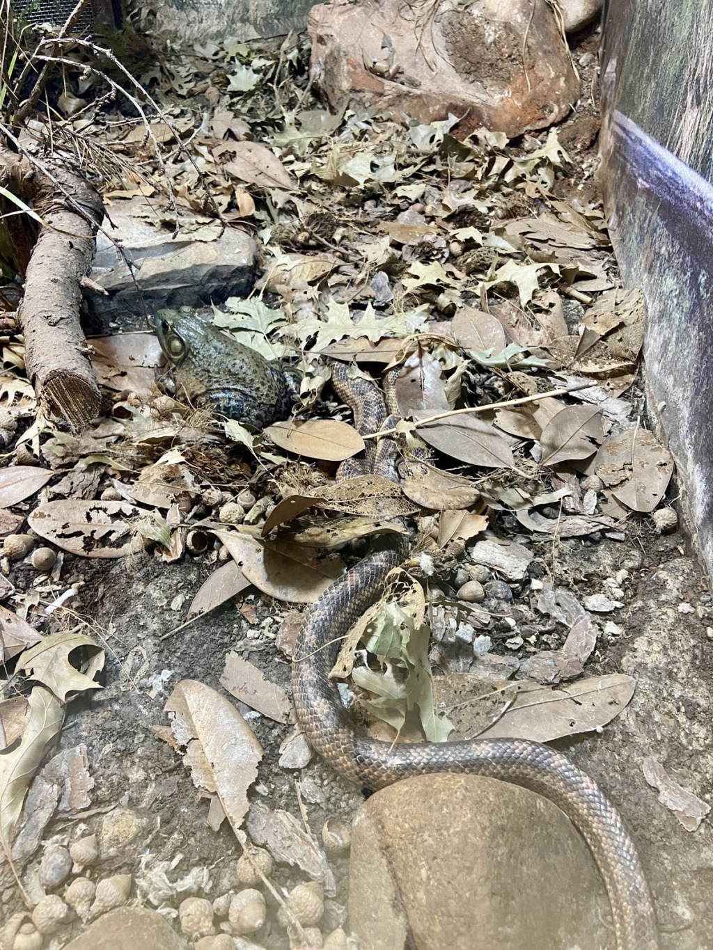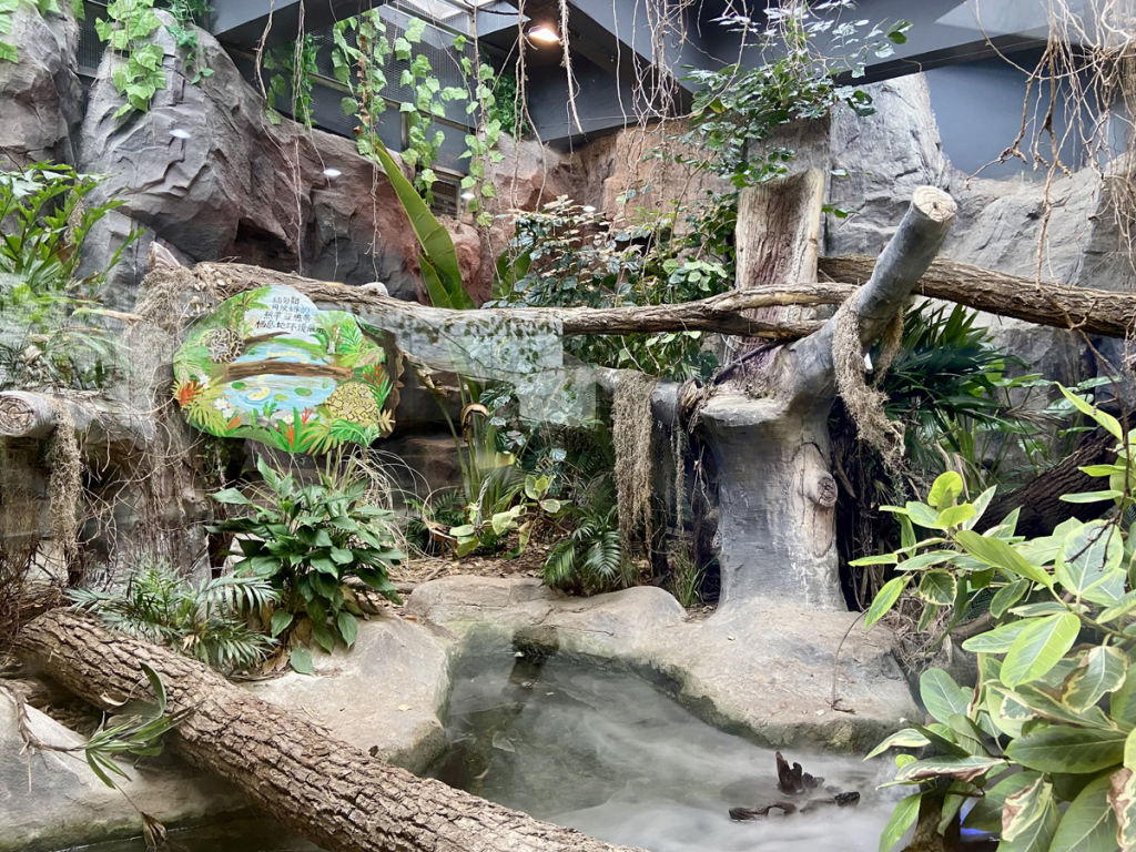 1月26日,澎湃新闻(www.thepaper.cn)记者现场探访看到,蛇类展区张贴了“蛇舞丰年”“蛇转乾坤”等祝福语和标志牌,引导游客自主探索认识各种蛇类。缅甸蟒、网纹蟒生活在模拟热带、亚热带栖息地环境的大展区,假山间有棕榈、万年青、常春藤、鹿角蕨等植物,大蛇卧在水边,2岁的幼年小蛇拥有单独的小屋;玉米蛇和美洲牛蛙共处一室,饲养员介绍,他们相处和谐,从不打架,都爱吃老鼠……不少蛇喜欢躲在树叶草丛里,需要仔细寻觅。