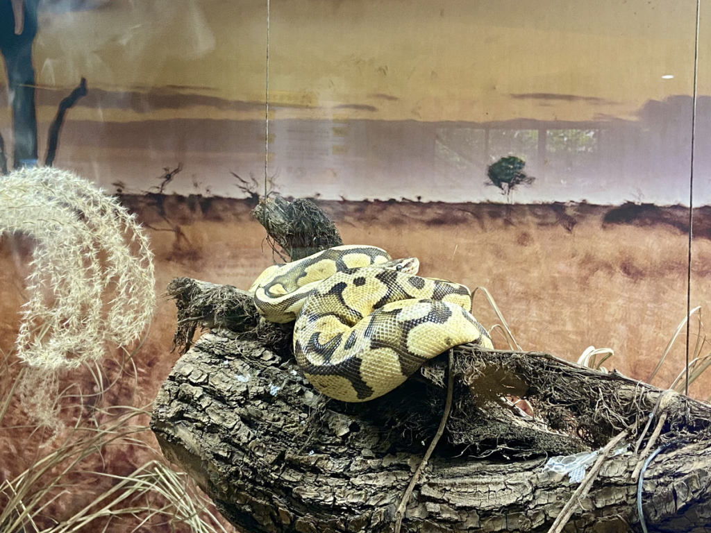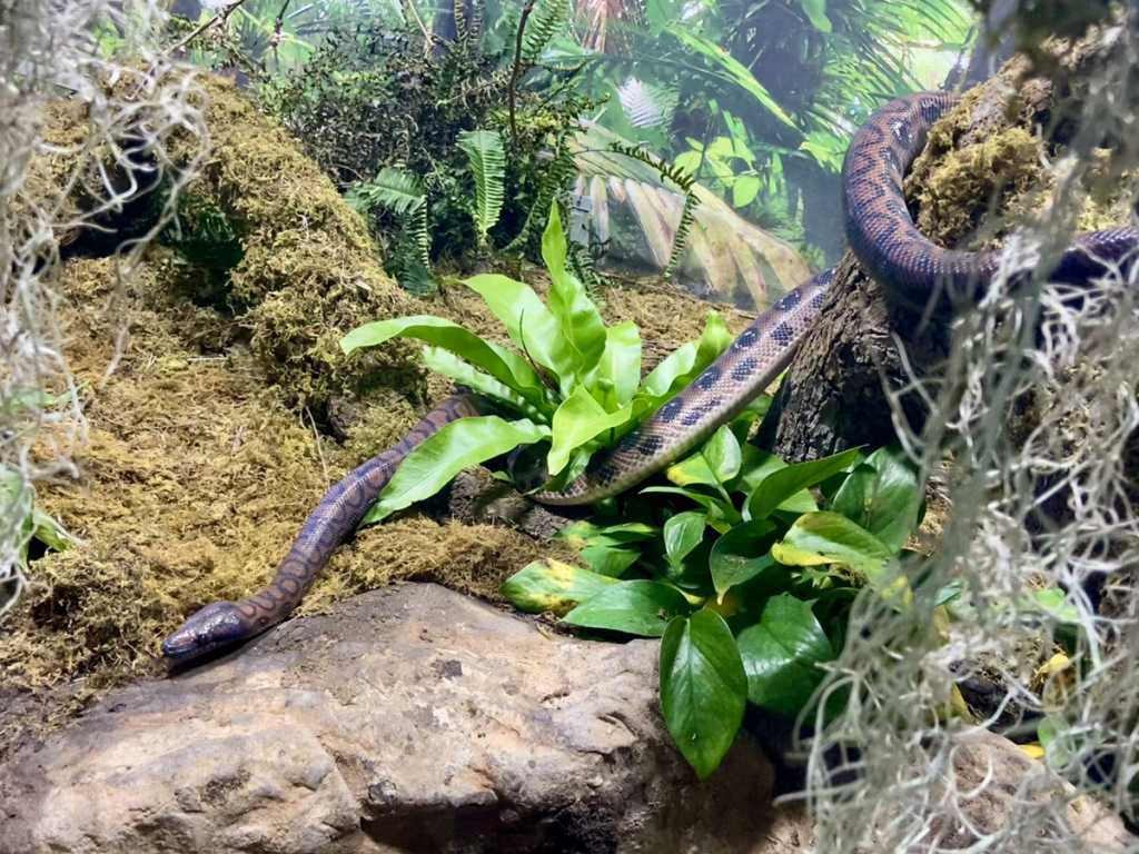 两栖爬行动物馆主管杨慧强介绍,园内蛇类资源丰富,目前展出有竹叶青、短尾蝮、舟山眼镜蛇、缅甸蟒、网纹蟒、红尾蚺、球蟒、彩虹蚺、棕黑锦蛇、赤峰锦蛇、玉米蛇,涵盖了游蛇科、眼镜蛇科、蝰科、蟒科及蚺科,共5科11种蛇类。展区内有加热设备,为蛇类提供保温环境。