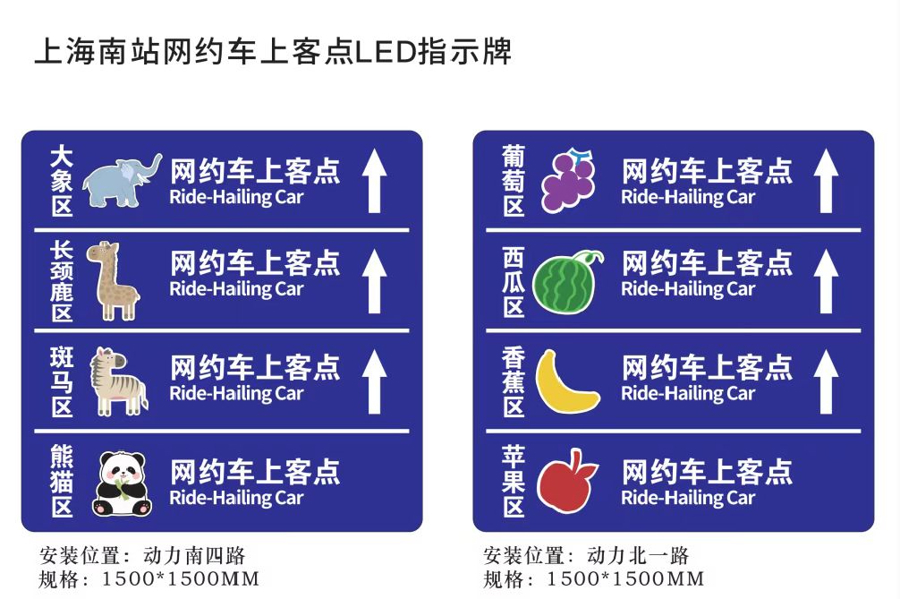 “以前乘客经常不知道自己在哪里,我们通过平台也很难定位到乘客,要在南站周围绕好几圈才能接到客人。”朱师傅说。而今,上海南站的北广场网约车上客点用紫色葡萄、黄色香蕉、绿色西瓜和红色苹果对上车区域进行了划分,南广场上客点则用熊猫、斑马、长颈鹿和大象等动物做了区分,司机能很快对应找到乘客的位置。