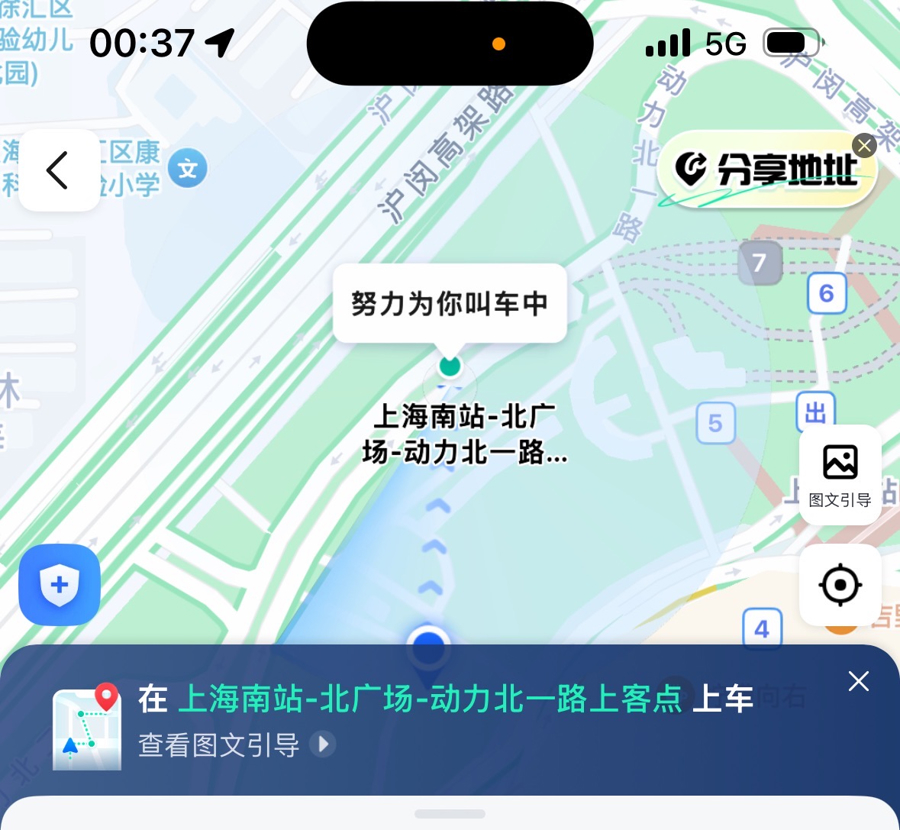 深夜在上海南站使用高德地图呼叫网约车,地点自动吸附到北广场网约车上车点。