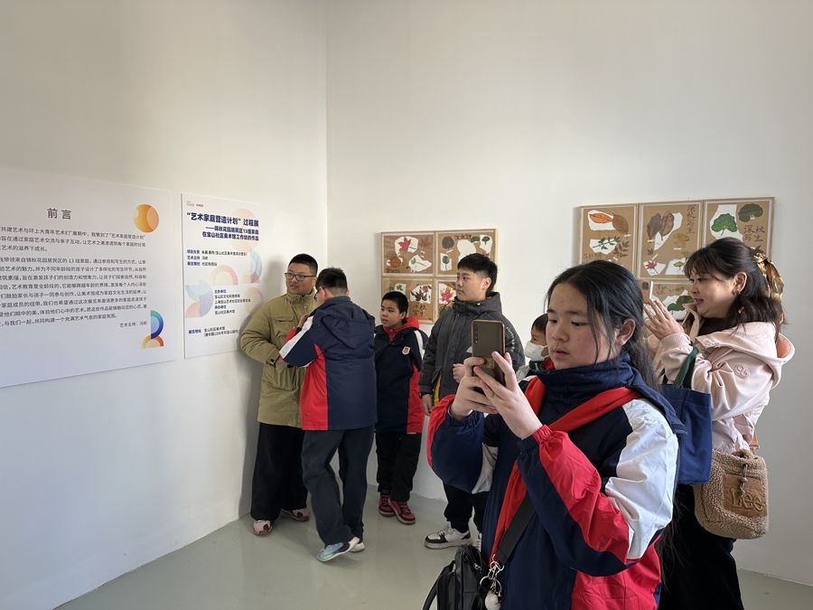 除了联动周边高校和居民区外,宝山社区美术馆还带动了上海市民办锦秋学校的馆校合作。作为“艺术家庭营造计划”的第三次社区美术馆工作坊活动,来自锦秋学校的初中生和家长们参与了“艺术家庭营造计划”的现场导览活动,展示在墙上的作品被带回家营造家庭美术馆,形成了馆校、馆与社区家庭的良性互动。