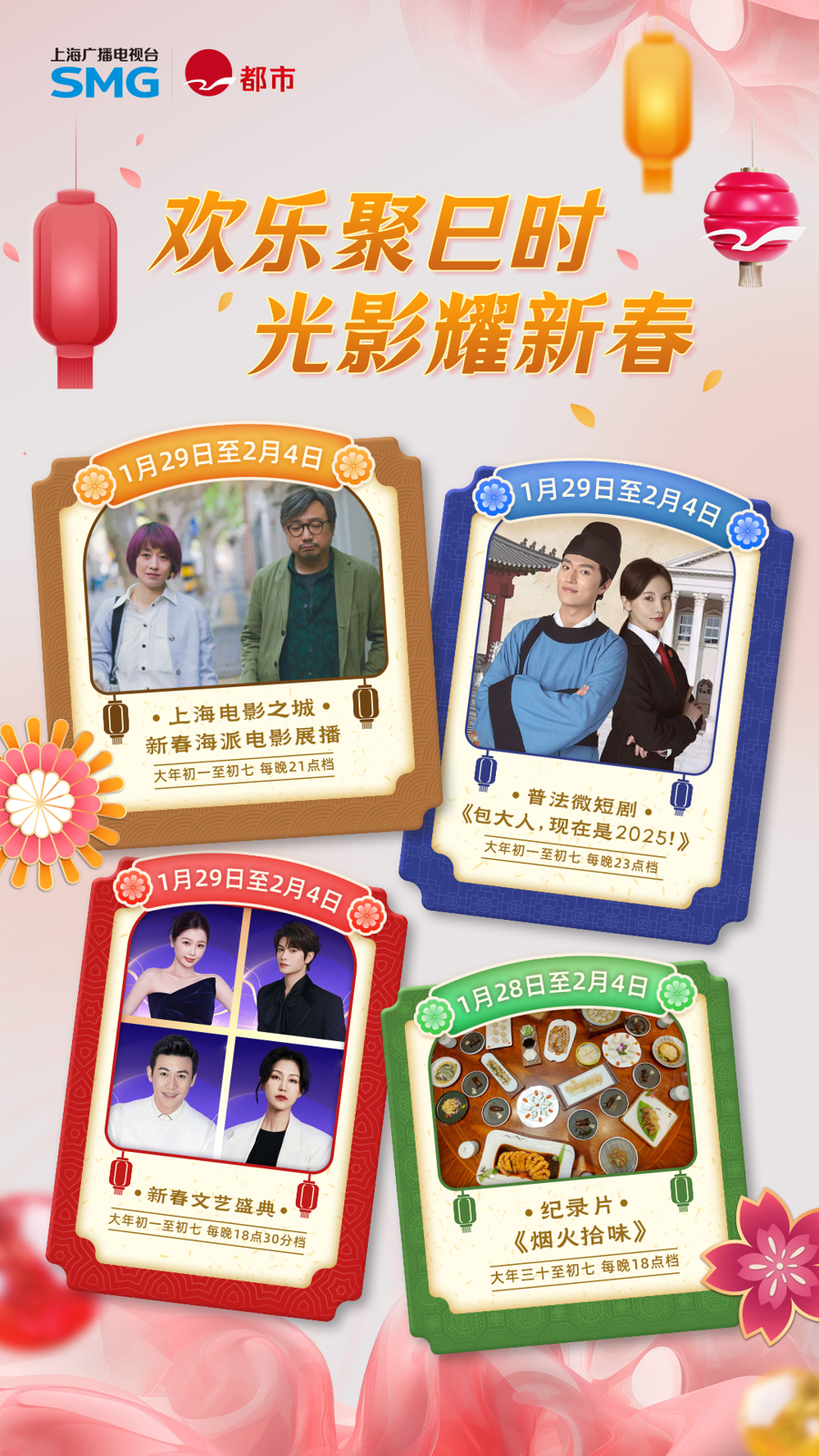 乙巳新春将至。2025年上海广播电视台都市频道也新气十足,给各位观众带来丰盛的春节”荧幕大餐“,新年遇新颜,都市频道焕新改版后迎来首个农历新春,靓丽、精致、欢乐的视听盛宴将伴观众过个幸福年。