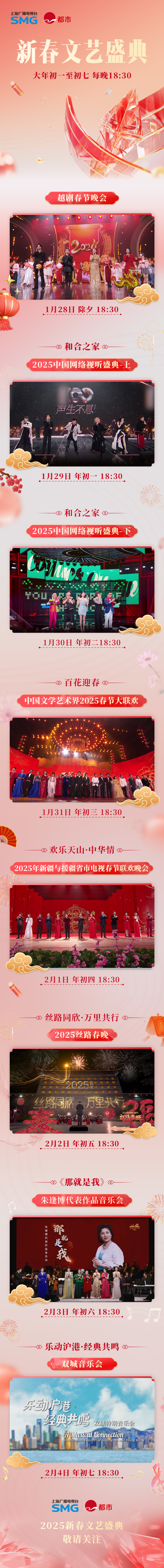 大年初一、初二播出的《和合之家·2025中国网络视听盛典》,汇集了2024年度最受欢迎的电视剧与创作者,从剧本创作到演技展示,再到创新的拍摄技术,全面展示了中国电视剧行业的进步与多样化。除此以外,《“百花迎春”——中国文学艺术界2025春节大联欢》《欢乐天山·中华情 2025年新疆与援疆省市电视春节联欢晚会》《丝路同欣·万里共行——2025丝路春晚》等优秀新春晚会将于初三至初五播出。另值得关注的上海知名老牌歌手《那就是我》朱逢博代表作品音乐会将在大年初六播出。大年初七将给观众朋友们送去《“乐动沪港 经典共鸣”双城特别音乐会》,沪港两地的音乐家代表将通过一场跨城空中音乐会,演绎具有特殊历史意义的经典音乐作品。