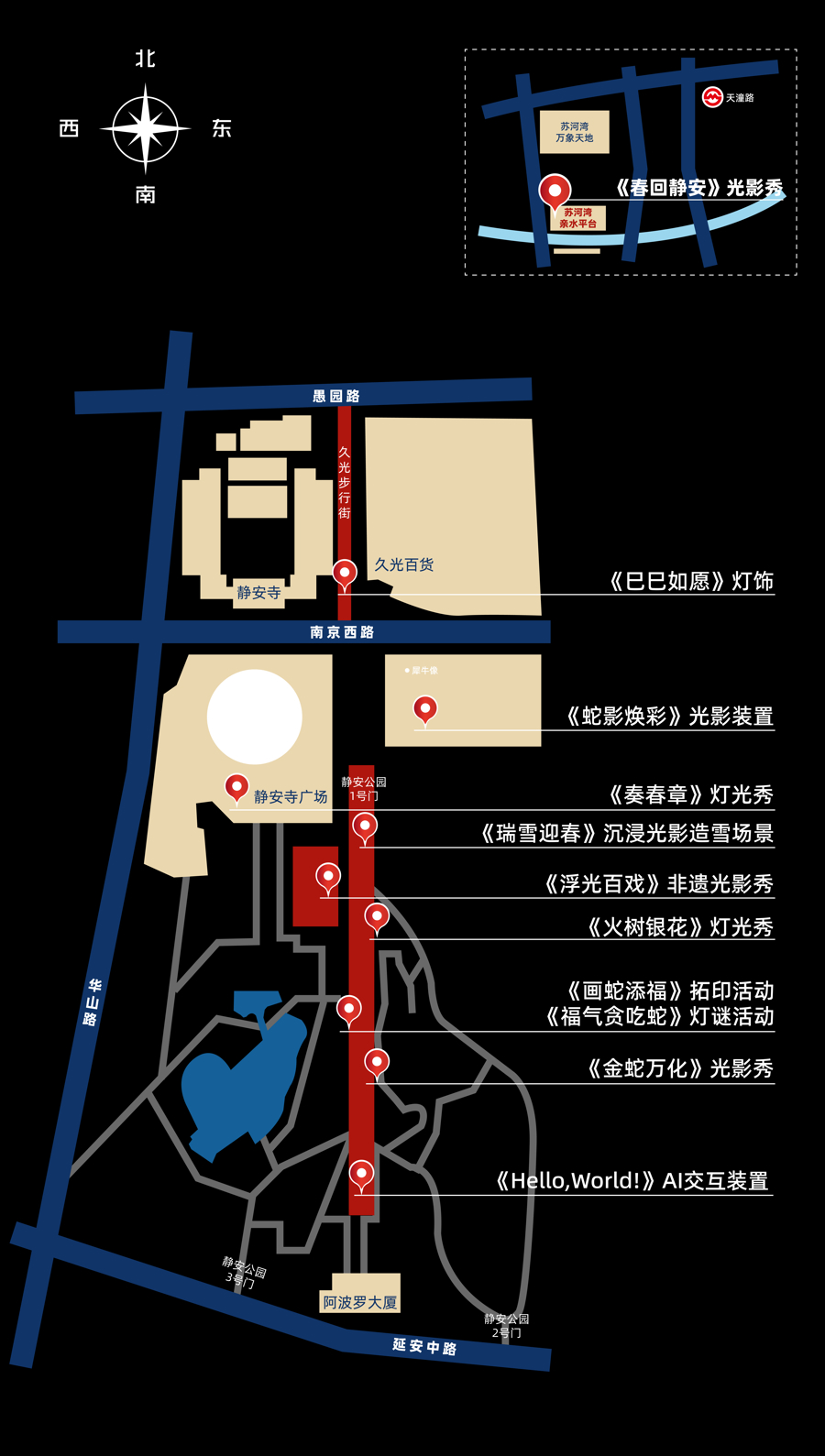 “闪亮·静安寺商圈”活动以“一轴五福”为布局,以南京西路为轴,串联久光步行街、静安公园、静安寺广场点位,为市民游客打造新春夜游活动新体验。走“蛇行五福路”,集齐“平安顺遂福”“欢天喜地福”“事事如意福”“非遗传承福”和“文化交融福”,蛇年从头富到尾。