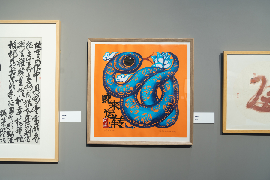 与此同时,正在举办的“蛇生肖艺术大展”汇聚了270件(组)“蛇”生肖艺术作品造型可爱、可喜,其中用盘扣(中式服装制作技艺)、海派剪纸、海派玉雕等非遗技艺打造的蛇,有写意的、有拟人的、有超乎常人想象的蛇形与蛇魂,观众在这些作品中能看到“蛇尖上的中国”。比如,海派剪纸《蛇来运转》是海派艺术家李守白完成的新作。艺术家将蛇的可爱、灵气和神秘浓缩在中国的传统纹样里,既显示了蛇的神态,又突出了蛇的智慧。蛇头所至,莲花盛绽,清香悠悠,与祥云中的瑞气交融,氤氲成一片祥和的气象,祝福人们在新的一年里,蛇来运转,福泽绵绵。