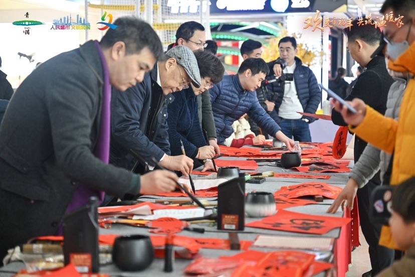 现场,各色的非遗摊位仿佛一条“国潮长龙”,竹编、剪纸、扇画、手工编制、皮影戏、焋糕等非遗艺术摊位和刺绣、扎染、缠花等艺术摊位吸引了许多小朋友驻足把玩。更有上海市和青浦区书法家协会的知名书法家们,以及来自青浦本土的少年书法家们泼毫挥墨,写春联、书福字,为市民群众送去门楹添彩、福气进门的好彩头。“吾尼每年都会参加区里的春节活动,有很多大师来现场写春联,贴在家里增添喜气福气,一年都有好运气。”一位阿姨笑容满面地说道。