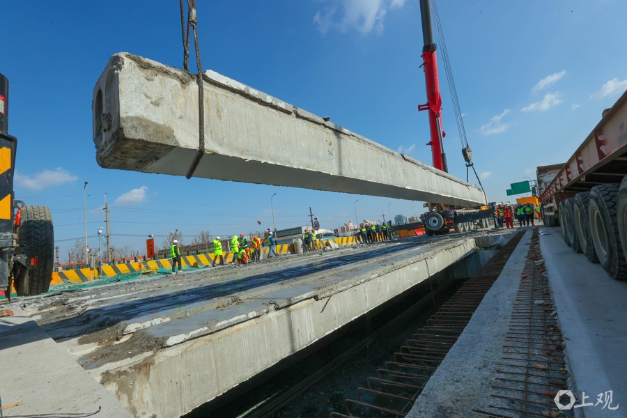 上海路桥建设者在吊卸外环线高架老梁。