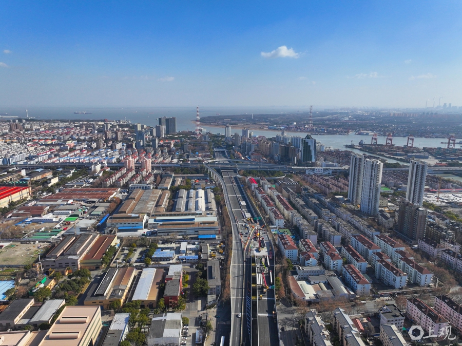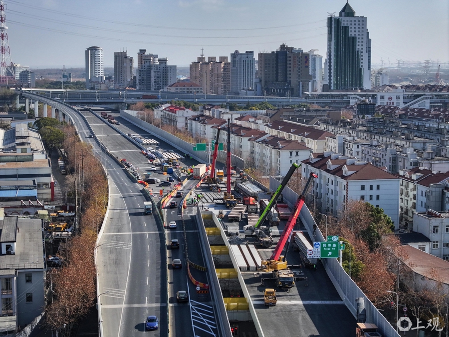 为最大程度减少施工对交通的影响,在交警部门的组织协调和大力支持下,泰和路高架段主线与同济路下匝道并板区域施工选择在车流量较低的春节期间抢抓时间施工。