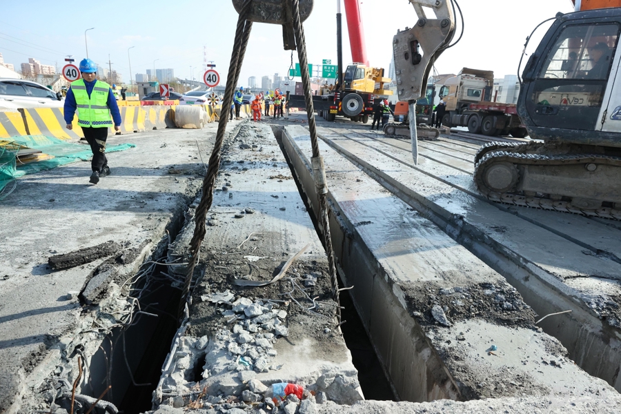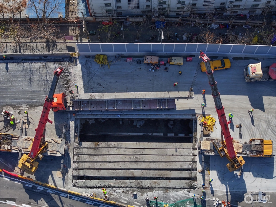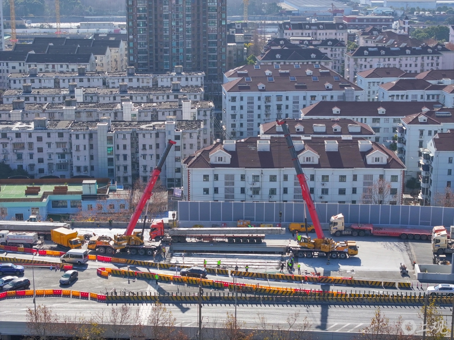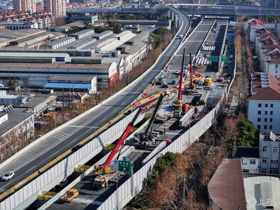 2025年1月27日,上海路桥建设者在吊卸外环线高架老梁。春节期间,S20泰和路高架桥大修项目不放假。