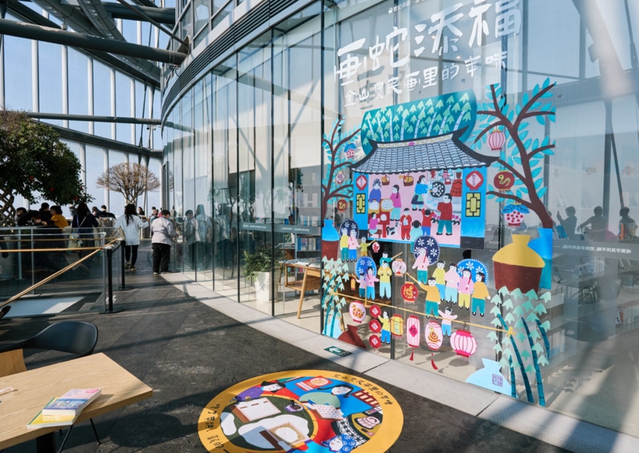 除了朵云书院·枫泾店,朵云书院·旗舰店、广富林店、戏剧店以及思南书局和诗歌店,都布置了画蛇添福打卡装置和贴纸,传统非遗金山农民画里的年味在各大书店弥漫开来。