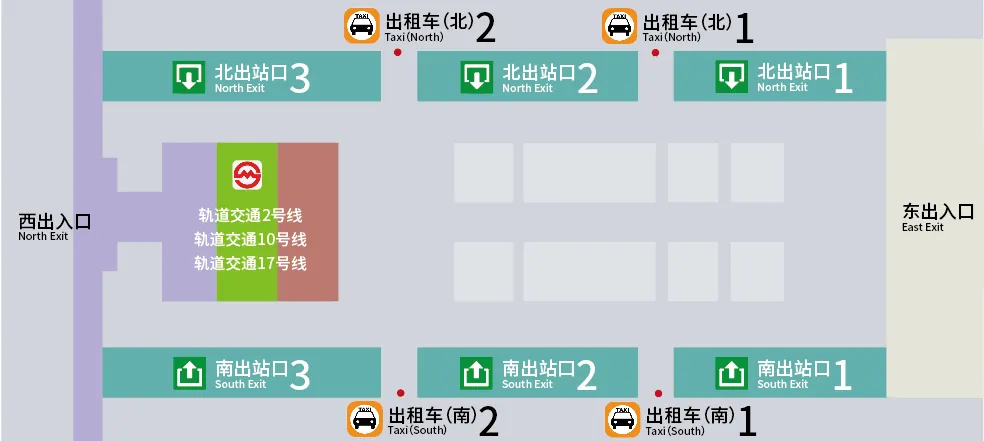 从南出站口2、北出站口2出来的旅客,可选择在出租车南1、出租车南2、出租车北1、出租车北2乘坐出租车;