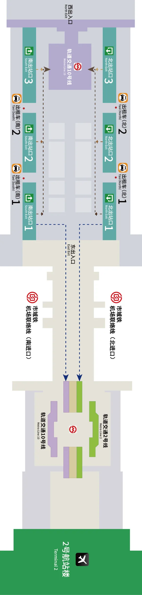 从铁路出站口出来的旅客,可自西向东走,前往2号航站楼方向。