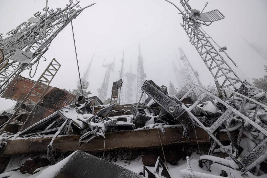 △美国加州,降雪覆盖了被“伊顿”山火烧毁的树木。