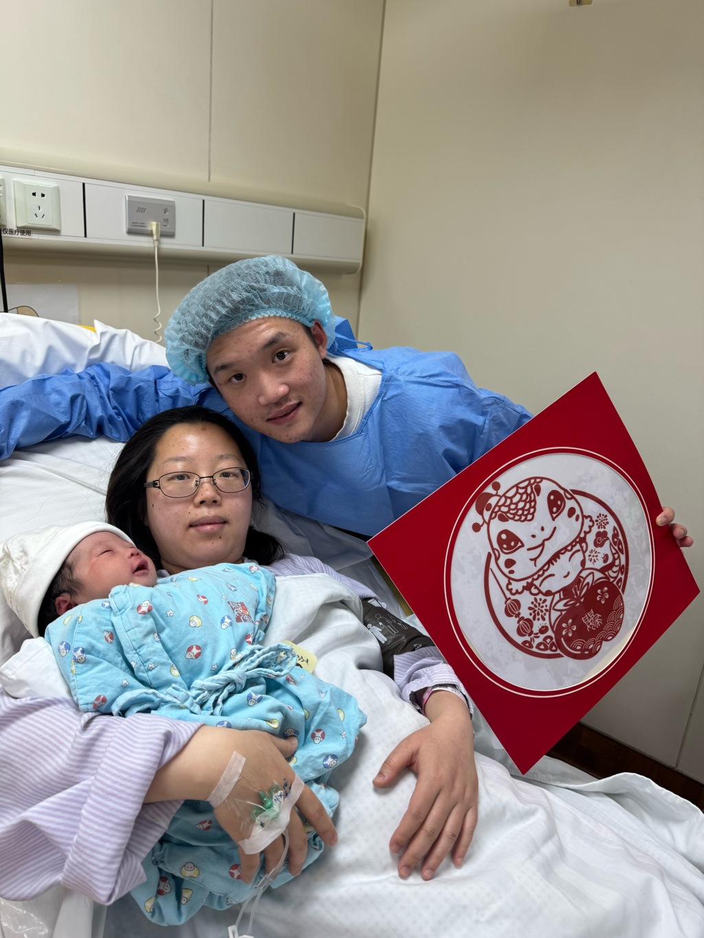 1:35,上海市第一妇婴保健院西院的第一个“蛇小弟”也呱呱坠地。宝宝的爸爸倪先生是一名羽毛球教练,他和妻子为宝宝准备了一个有趣的小名——“羽毛”。 在医务人员递上原创的生肖窗花后,“咔嚓”,这个小家庭的第一张合照诞生了。