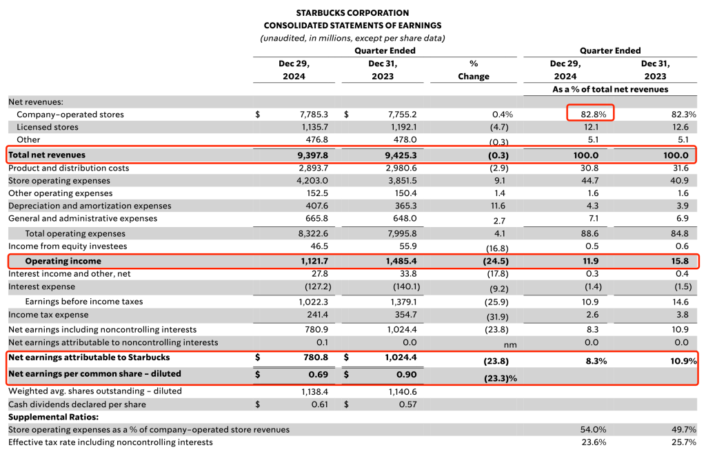 财报指出,第一财季营业利润率同比下降390个基点至11.9%,主要原因是去杠杆和支持“重返星巴克”的投资,包括门店合作伙伴的工资、福利和工时,以及取消非乳制奶定制的额外费用。